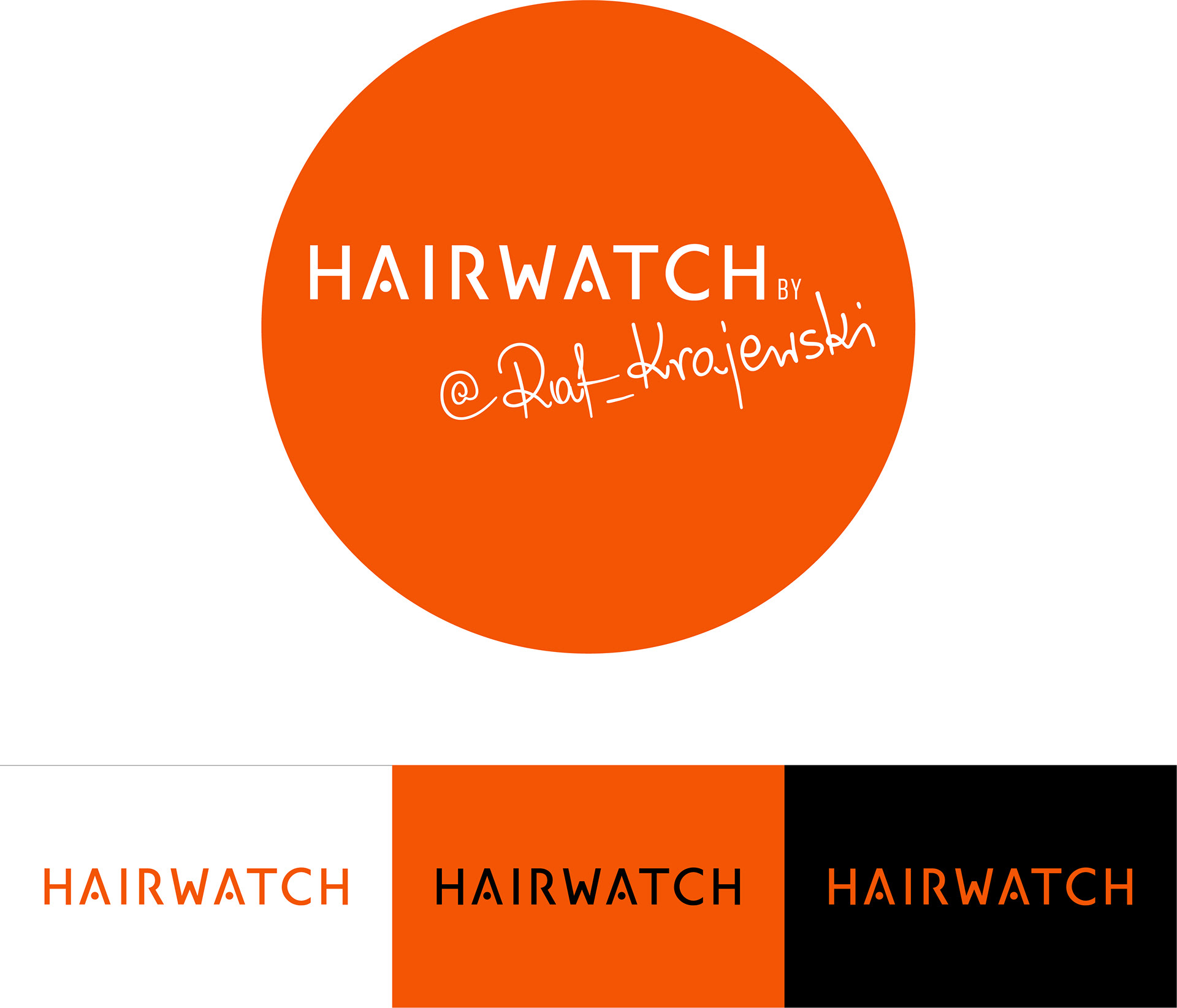 Logotyp dla salonu fryzjerskiego HAIRWATCH. Założeniem było wkomponowanie sygnatury wzorowanej na odręcznym piśmie stylisty fryzur.